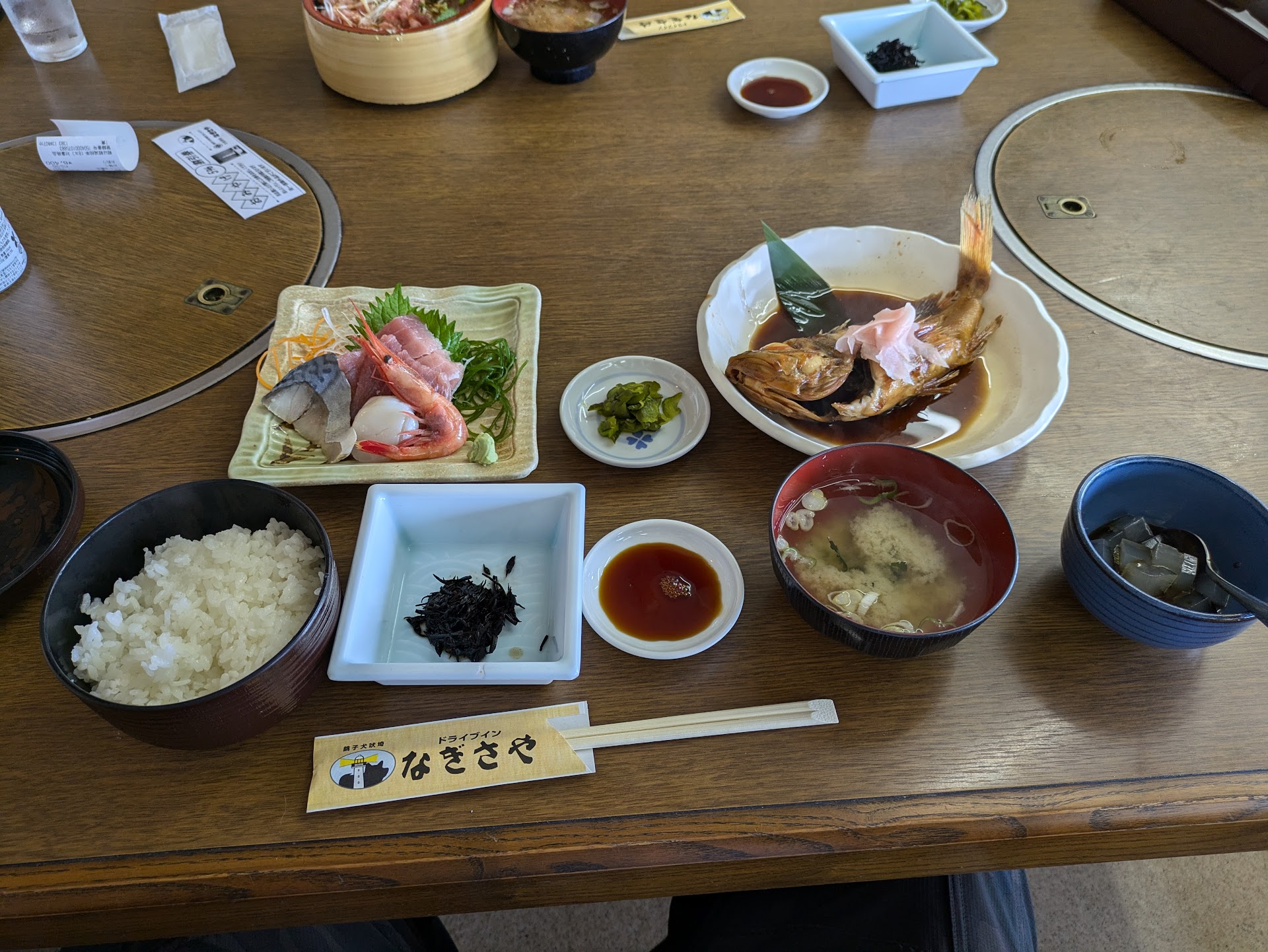Read moreオペレーションが全くダメでした。 レジ打てる人が一人しかいない(社長さんだそうですが・・・)とのことですが、一つ注文を取る度に奥に行ってしまいしばく戻って来ません。(食券をレジで注文するシステムなのでレジに人が居ないと客は一人も中に進めません) さらに唯一レジを打てる人が配膳やったり、挙げ句の果てに売店のレジに行ったりします。(その間食堂の行列は放置) レジの人はレジに集中し、あちこちウロウロしない。これだけでもだいぶ違うはずです。 またレジの人と従業員の連携も全く取れておらず、客の行列を見ても誰も声掛けしない。誰かレジ打てる人は?と聞いてもレジ打てる人が居ないから・・・と言うだけでその人を呼ぶわけでもない。客商売なのに全く客の方を向いていない姿勢には甚だ疑問です。 社長と呼ばれている人がかなり若く見えたのでもしかすると先代からきちんと引き継ぎが出来ていない等事情があるのかもしれませんが、残念ながら古き悪しき観光地食堂と言う印象を強く持ってしまいました。 味はまぁ普通でしたが刺身がちゃんと切れていませんでした。あとカサゴの煮付け定食を頼んだのですが出てきたのはメバルのように見える・・・?まぁカサゴは今の時期旬じゃないから良いんですが、それならそれで一言注意書きがあっても良さそうなもんです。むしろメバルアピールした方が今の時期はプラスになりそうなもんですが。(メバルのメニューはそもそも無かったので取り違えとかでは無い) 立地が良いだけにもったいない。人手が足りないなら自動券売機を導入する等色...