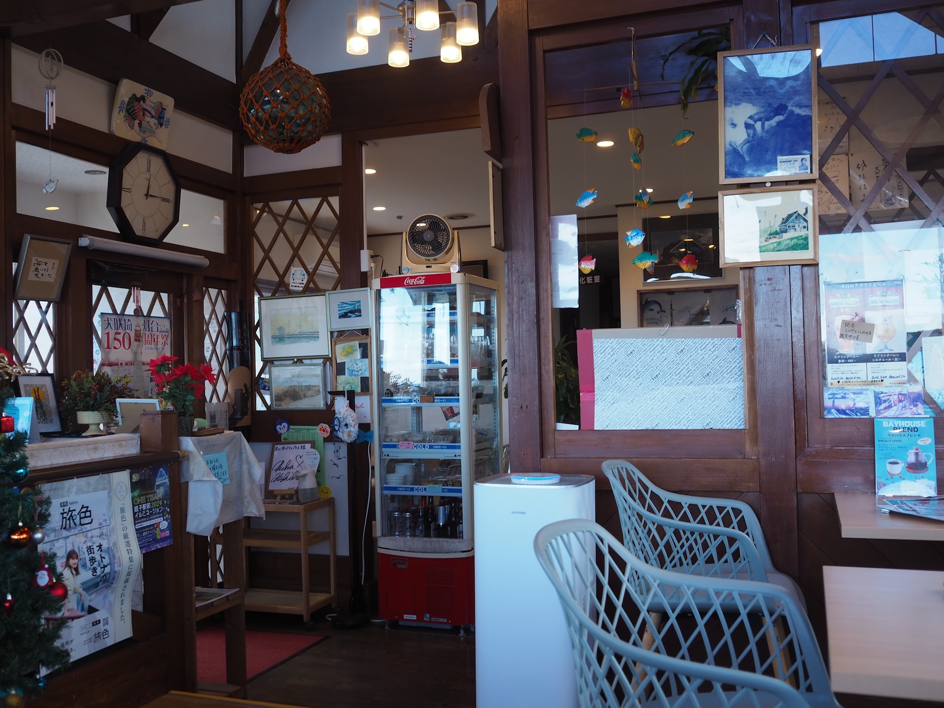 店内は入って右手が3面ガラスの空間で、犬吠埼の灯台も含め海が広く見渡せます。 左手の空感は1面のみガラスなので、抜け感はあまりないです。 ちなみに合計です10テーブル以上はある感じでした!