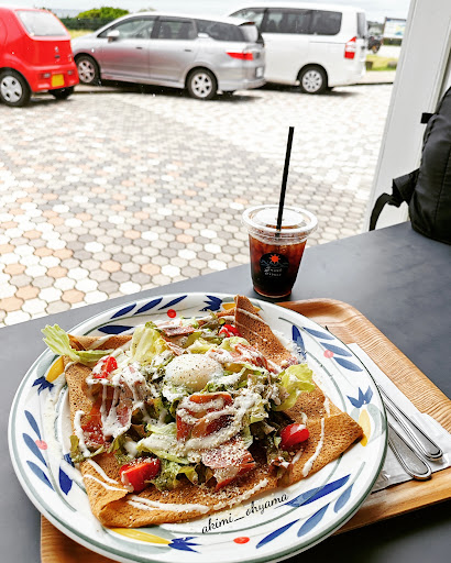 灯台付近有間食日式定食的店, 但不太吸引. 隨即走到隣店 Seaside Terrace, 看到他們的宣伝看板上有法式 Galette 配牛油果/ 火腿等材料, 賣相非常吸引, 而且份量剛好, 於是到受付下単. 点了生ハム温玉ガレット (Galette with Ham and Egg) 和 Iced Coffee, 選了望海(+停車場)的座席去享受這頓午飯. 不消一会可以到 counter 取餐.