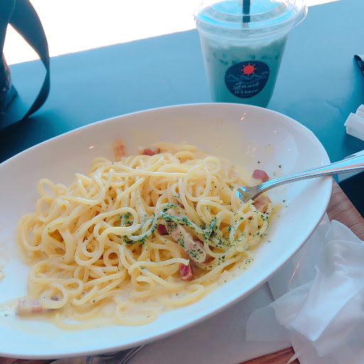 席は自由で、フードコートみたいな感じで買ってきて座ります。パスタ系のお店とパン屋さんがあります。 カルボナーラを食べましたが普通に美味しかったです。 ドリンクメニューが豊富で悩んじゃいました。あまり普通のカフェには置いてないドリンクがたくさんありましたよ。