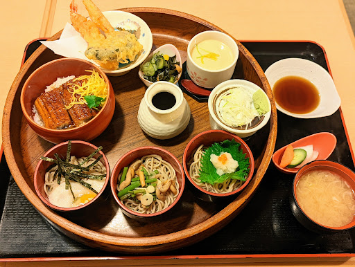 うなぎ、天ぷら、蕎麦3種の御膳を注文🤤 大きい樽の中にぐるっと丸い器に入った様々な料理👏 視覚から美味しさを感じるスタートダッシュ💨 ふわっと軽い口当たりのうなぎ😋 コシある蕎麦に各種の具材でバリエーションあり旨し😋 サクうまの天ぷらもええですなぁ〜 美味しかったです、...