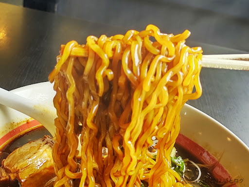 【麺】 幸楽苑の代名詞ともいえるおなじみの多加水熟成麺ですね。 表面がつるつるでモチモチっとした食感。 フライドガーリックと一緒に食べることでさらにスパイシーさが増すようです。