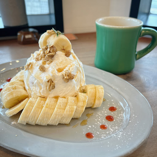 ローストビーフ丼とチーズハンバーグプレートを食べました。ローストビーフ丼は小さめと書いてありましたが、お肉が分厚く、たくさん乗っていて、大変食べ応えがありました! チーズハンバーグプレートもとても食べ応えがあり、大変満足でした! デザートにはそれぞれ、バナナパンケーキとパフェプレート?を頂きました。バナナパンケーキのパンケーキは、しっかり系で、小さめのが3.4枚クリームに包まれていました。バナナがたくさん乗っていて、とても美味しかったです🥰パフェプレートは大きいソフトクリームと小さいケーキ4つ、炭酸やシロップ漬けされたフルーツが乗っていて、量もしっかりとあり、満腹でした〜 笑 もしデザートをシェアするなら、パフェプレートがおすすめです!パンケーキは食事後に1人でも食べられちゃいそうな大きさでした🥞