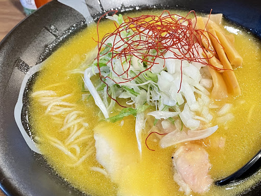 塩白湯の文字通り、乳化され黄金に光るスープから細麺ストレートがちらり。上には厚い鶏チャーシューが3枚、シナチク、ネギと玉ねぎ、龍の髭が上にトッピング。器も見た目もかなり美しい芸術作品のよう。濃厚でバターのようなスープと麺が合いとても美味しかったです。鶏チャーシューは胸だと思われるがじっくり低温調理されているのだろうか、しっとりでプルプルで柔らかくかなり美味しい。また、玉ねぎとスープの相性が驚くほど良く、気づいた時にはスープを飲み干していました。 値段的にも妥当と感じました。