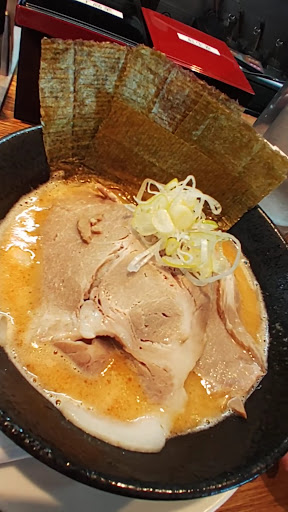 【ビジュアル】 泡系濃厚豚骨スープにレア肩ロースチャーシューが鮮やかな一杯。大判の海苔が家系ラーメン感を演出。