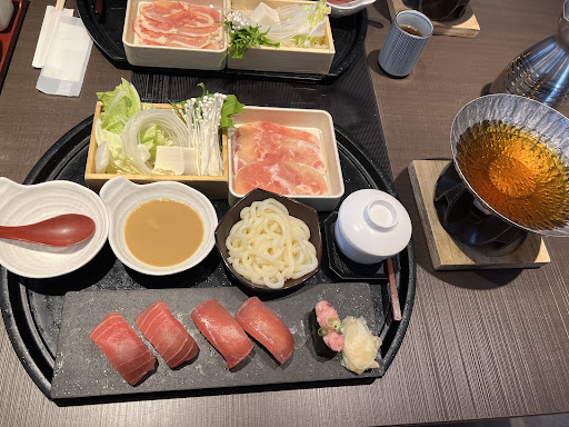 自宅に割引チラシが入っていたので行ってみました。出来たばかりらしくお店は中も外もとってもきれいです。 予約のおかげで待つことなく入店、席に着いたら卓上ディスプレイを使ってオーダーします。 選んだのは牛豚しゃぶと上寿司の食べ放題。 このコースではおつまみの単品メニューや串揚げ、デザートも食べられます。 制限時間は100分、早速画面を見ながらポチポチしてたらあっという間に最初のオーダーが届いてびっくり。 提供は常に早く店員さんの手際も良くて、写真を撮る間も無く食べ続けました。 鍋は6種類くらいから2種のお出汁を選びます。 他店のビュッフェに比べとても豚肉の肉質がよいと思ったら三元豚なんですね。お寿司も新鮮で味がよい!串揚げもアツアツでカリッと揚がっていました。 季節限定の蟹クリームコロッケがめちゃくちゃ好みでテンション↑↑↑! デザートの杏仁豆腐やソフトクリーム(こちらも種類が豊富)は小さめで何個でも食べられそう。季節のシャーベットもおすすめ。 ソフトドリンクでは一般的なもののほか、レモンスカッシュやホットのお茶がたくさん選べるのが嬉しいです。 狭いけれど入り口付近に喫煙室があるのも◎。 おいしかった...