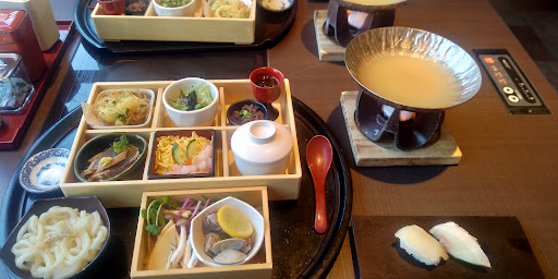 ドライブ中、Googleマップでお昼ご飯を取る店を探していてたまたま入った。注文したのはランチメニューの松花堂ランチ1290円(税抜・税込1419円)で、ドリンクとデザートが付いてくる。