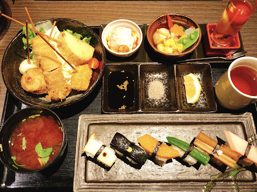 Read more土曜日のランチに行きました。お初です。 予約で12:30に入りましたが、ほぼ満席!! 注文したのは「串揚げセット」で、お寿司と揚げ出しとポテトサラダ、赤出汁、フルーツのシロップ漬けのようなものが最初に出てきました。 串揚げのエノキとプチトマトに薄切りの豚肉が巻いてあったのと、うずら卵が1つ、ポテトサラダに生ハムが少し付いていた以外はすべてがお野菜!! 見た目も麗しく、女性が大好きなお料理の数々。 ランチには飲み物とデザートがついていましたが、ホットコーヒーをチョイス。デザートは栗のアイスクリーム。これまた絶品でした♪ これで税抜1380円。 なんといっても主役のお野菜の味が濃くて感動モノでした(♡ω♡...