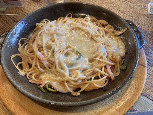 Read more駐車場あり(店舗向かいの通り角)。感染対策(入口に消毒)あり。カウンター席のほかは中央に大テーブルがあり、その周りがぐるりと席になっています。(パーテーションあり)。パスタとトーストが主なメニューで、セットや大盛りもリーズナブルです。パスタは鉄板で出てくるので最後まで熱々。ナポリタンソースににチーズがのったパスタを頼みましたが中盤には端の方がカリカリになるお楽しみ付き。セットのドリンクは今風で言えば昭和レトロな懐かしさがあります。味は美味しいけど少し薄めかな?と思いきやソースが下の方に…。次回はよく混ぜて食べようと思います。コロナ禍でほぼ黙食でしたが「熱い!美味い!」と連呼したい気持ちでいっぱいでした。美味しいものが熱くて食べられないもどかしさと心地よい雰囲気のあるお店でした。
