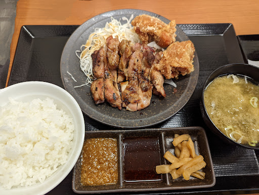 Karaage is fried chicken with a thin and crispy batter. In addition, the miso soup that comes with the set meal is delicious with a slightly thick miso soup made with grated yam kelp.