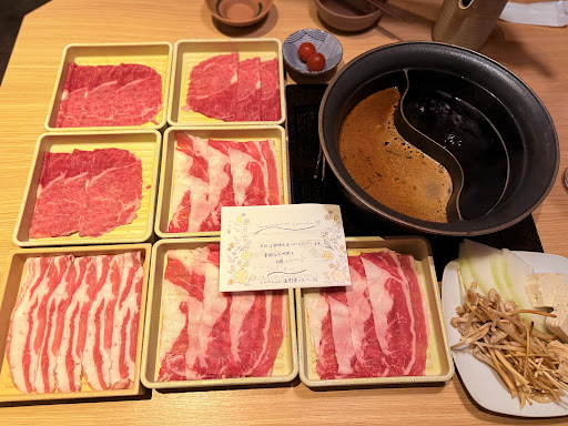 Shabu shabu restaurant located near Lala port in Ebina. Great ambience. You can get the All-You-Can-Eat option for 2 hours. They have beef, pork and chicken options as well. So you can have your pick. You get lots of vegetables with all-you-can-eat like mushrooms, lotus root, greens, carrots, tomato, etc. You get Japanese items like tofu, mochi, etc. This also includes desserts like tiramisu, ice cream, etc. For the shabu shabu, you can choose 2 types of soups. We took a Chinese soup with herbs and a Garlic based one. Both were delicious. Once you are done with each round, you can order from a touch screen display. They also have alcohol options purchased separately. Even after 2 drinks and the all-you-can-eat set, the amount per person is only around 4000 yen which is really cheap. Each of the items were delicious. Service was fast and efficient. Definitely...