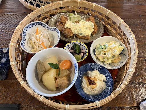 頼んだのは、1650円のデザートつきランチ。デザートはミニパフェともう一種から選べます。オススメはミニパフェ。想像よりも大きくてビックリしましたが美味しかったのでぺろりといけました。 ランチは竹籠に小鉢がいっぱいな提供スタイル。コースターからコーヒーカップまで、器が全部違うので目でも楽しめます。