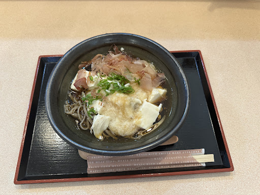Read more揚げ立ての天麩羅は衣がサクサク。蕎麦は10㎝くらいで、すすると言うより箸で摘まんで食べる感じ。ショッピングセンター内にあり、中からと外からの2カ所入口があります。おろしぶっかけの出汁は冷たくて美味しかったがイメージと違った短く平たい越前蕎麦に意...