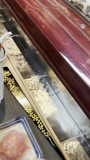 車を止めさせてもらいもらい、オーラが漂う建物の中に入っていきました。 こういった仕立てのお店は初めてです。 カウンターとシャリケースの間に溝があり、一定間隔ごとに穴の開いたパイプから、水がぴゅーっと噴き出しています。 これで指を洗うという訳ですね。