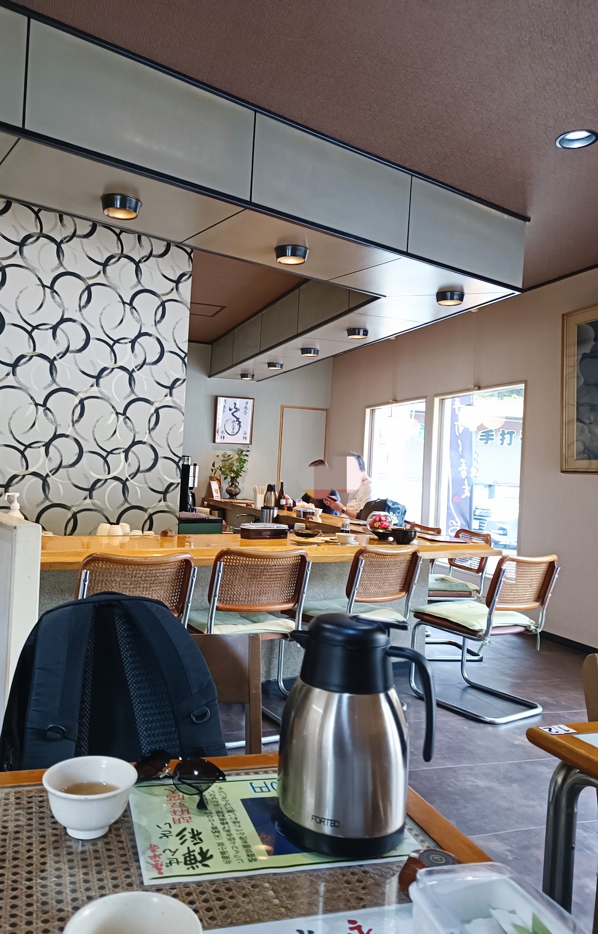 Read more9月日曜の13時過ぎに来店すると先客二組だけですんなりと着席。福井に来てから越前そばをひたすら食べているので、ここでもおろしそばを注文。 待つこと10分弱で3人前が揃います。 麺は手打ちとの事で期待しつついただくことに。確かに特有の腰と喉越しで美味。茹で加減も少し硬めなのが良き。出汁が効いたツユも薄すぎずいい塩梅で蕎麦湯がなくても飲める濃さ。 全体的にバランスが取れていると思います。 半玉追加すると梅雨がかかった状態で提供されますが、大根おろしは乗っていないので少し寂しいかな。 置いてある一味が思いのほか辛くて質の良いものを使っているとわかります。 観光地アルアルの適当なそばではなく、本格的な手打ちがこの値段でいた...
