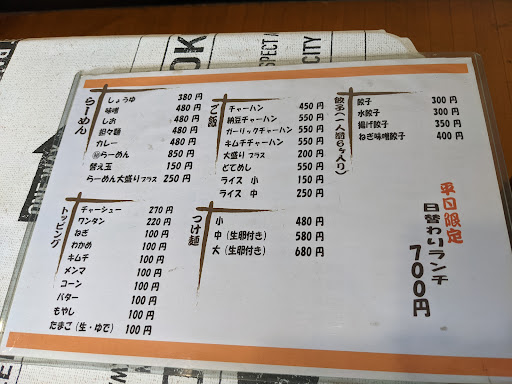 メニューを見ると、醤油ラーメン380円、その他ラーメン480円、つけ麺小480円、大にしても680円と激安。 今どきこんな金額で食べられるのはフードコートくらいしかパッと思いつかないですが、何故空いてるのでしょうか。 もっと混んでいてもいいと思うのですが、もしかして難ありなお店なんでしょうかね。