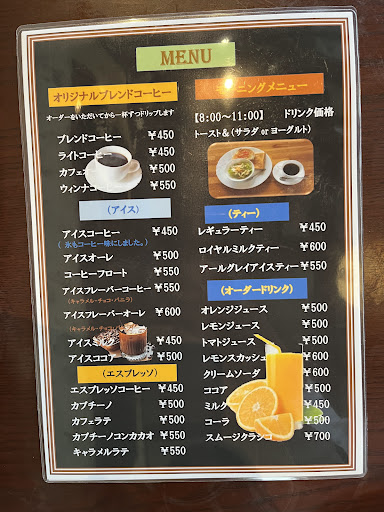 Read moreアイスコーヒーの氷は、水ではなくコーヒーを凍らせたものです!時間が経っても味が薄まらず、最後まで美味しくいただけます。オレンジジュースも同様に、ジュースを凍らせた氷で、輪切りのオレンジが添えられていて見た目も爽やか。こういった小さな工夫に、店主さんのこだわりを感じました。