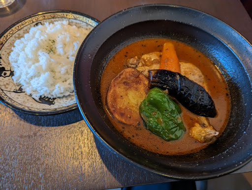 Read moreキノコとオクラのスープカレーをポークでいただきました。 具はその3つだけですが満足。味がかなり自分好み。これは納豆も合いそう。 家の近くにあったら週1で通うかも。 辛さは3番を選択。4番でもいけそう。それほどきつくないので、5番でも物足りない人がいるかもね。