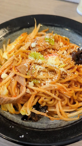 ぱっと見は、スパゲティナポリタン! 食べると炒めたのか?香ばしい香りがするケチャップ味の焼そばみたいな感じ… 具のキクラゲやもやしなどにはちゃんぽんを思わせる味なのに後味は、スパゲティナポリタン!