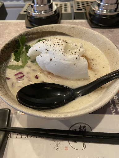 と大学生バイトの子が親切に教えてくれます。 卵黄はねっとり硬さのあるものだったので、冷凍してねっとり卵黄をつくりつつ、白身はメレンゲにしてるのかな、食品ロスなくて良いと思いました。 鶏むねのチャーシューはちょうど良い火入れで柔らかいですが、低温調理器または温度計は使ってなさそう。柔らかくも少し硬さを感じました。(肉の旨味が少し逃げている感じがしました)