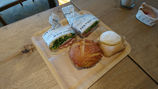 おしゃれなカフェ併設の焼き立てのパンのお店という口コミで訪問。定番のトーストセットを試してみました!!トーストは自分で焼くスタイルと店員さんの説明を受けて???羽田空港からのフライトで超腹減りだったので野菜たっぷりのサンドウイッチを追加して窓際のカウンター席に着き待っているとトーストしていない食パン2枚とバターとミニサラダとコーヒーが木のプレートに載ってきました。その後にデロンギの可愛いポップアップトースターを置いてくれてお好みで焼いて下さいとのこと。私は、熱々のトーストをサクッとするのが大好きなのでテンション急上昇でした。焼き上がりまでにサンドウイッチをいただき満足。メインのトーストはサクサクで中はもちもち自分好みで大満足でした。焼き立て大好きなので1枚ずつトーストしましたよ。星5つにしなかった理由は、自分的にはホテルのモーニングの様にバターが常温ではない点で。バターは2ブロックあり多いとは思い罪悪感が湧きましたが残すのも失礼だなぁと自分に言い聞かせて美味しくいただきました...