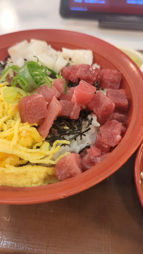 角切りのマグロとイカ 錦糸卵と刻み海苔 とろろの付いたやつを大盛りお新香と味噌汁セットでいただきました!!