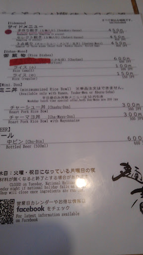 頼んでから、メニュー裏面に「ランチ」を見つけてミニチャーシュー丼を追加。 「ボーーッ」と音と共に、香ばし香りが!多分、チャーシューを炙っているのかな?楽しみ楽しみ…店内はちょっと寒いなぁ。