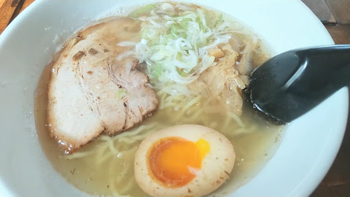 で、ラーメン登場! スープは透明、熱々、お味は…うん、あっさり塩ラーメン。和風のやわらかな香りと旨みを感じます。麺は中細ちぢれ系、コシがあるタイプ。軽く炙られたチャーシューの香ばしい香りも良い。 でも、食べすすめると塩の角が気になり、最後はしょっぱくてスープを最後まで飲み干す事は出来ませんでした。