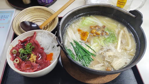 結論は、料理は旨いが、その他は「ム~」という残念感がある。私達が、店内に入ると先客が、1名が1組、2名が3組の計4組。私は「ラーメンと、ミニ馬肉丼のセット」、連れは「甲斐道セット(ほうとうと、ミニ馬肉丼)」を注文。連れの注文に「ほうとうは、時間が掛かる上、先客がいるので更に時間がかかる」と、女性店員が説明。どの位、時間が掛かるのか説明もなかったが、ここの口コミを見ていたので、想定内という事で、そのまま注文。他の人達が、注文した物を観察すると、やはり馬肉丼、甲斐道セットが多かった。1組、5分チョットの間隔で、料理が出てきて、25分後に、私の「ラーメンと、ミニ馬肉丼のセット」、更に10分後に、連れの「甲斐道セット」が出てきた。馬肉丼は、アッサリとした馬肉が、とても美味しかった。食べながら、普通盛りの馬肉丼にして、お腹一杯にしたかった、と思うほどであった。ラーメンは、昔ながらの味で、文句はなかった。ほうとうは、野菜が十分に入っていて、良く煮込まれていて、これまた文句なしであった。難は、店内である。カウンターの足元に、殺虫剤スプレー等が転がっていたり、使われいないテーブルの上が、雑然としていたり、清潔感が無い訳ではないが、ちょっと残念感が払拭できない。後、これは客には関係ないが、座れる座席があるのに5~6名の来店客を「時間がかかる」と言って、帰しているのを見て、随分ともったいないと感じた。この店には、時間に余裕を持ち、気長に旨い物が出てくるのを待つ覚悟で、行くことをお勧めします。...
