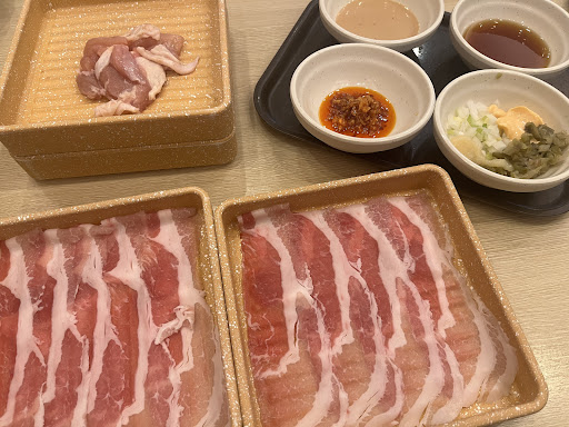 Read more家族と土曜日のディナーに行きました。店内は満席だったので1時間程待ちました。次々にお客さんの中には待ちきれずキャンセルする人もいて電話で予約も出来て便利だと思いますがその日は店員が予約も出来ないほどでした。 ラムしゃぶでアヒージョ風出汁、マグロ、サーモン、玉子焼きの寿司を注文しました。 ラムは独特の匂いがありアヒージョ風の出汁に合うと思います。つけだれに色々セレクトしたがいまいち?牛肉は筋っぽい、鶏肉は小さすぎで寿司はネタが薄くしゃぶしゃぶにできる位で水っぽくサーモンは冷凍やけして口に合わない。 ドリンクバーのジュースも薄い感じ、唯一野菜が新鮮なのが救い。食材全体がどれも特徴がなく残念!食べ放題なのでお腹はいっぱいになるがとても美...