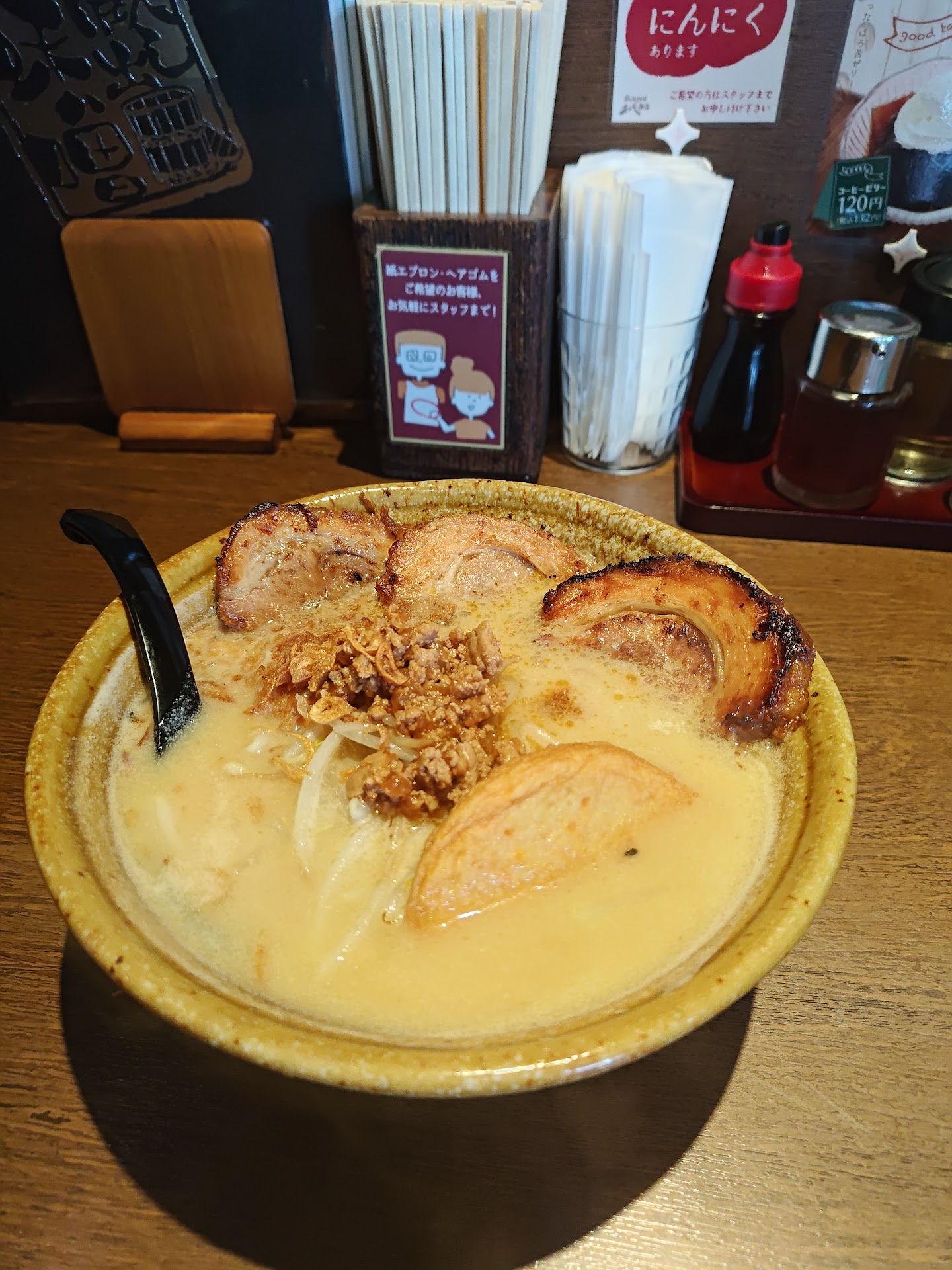 子供用の椅子も置いてあったので子連れ対応をしていると思いますが、信州味噌ラーメンに山菜が入っていたり、北海道味噌ラーメンのニンニクがややきつめだったりと『大人にとっては美味しく堪能出来るけれど子供には不評そうな要素』があるので、子供には九州味噌ラーメンにするか、サイドメニューのチャーハンや餃子にする方が良さそうだと思いました(九州味噌が子供向きかどうかは食べてないので分かりませんが) 北海道味噌ラーメンにフライドポテトが乗っているのも面白いと思いました。