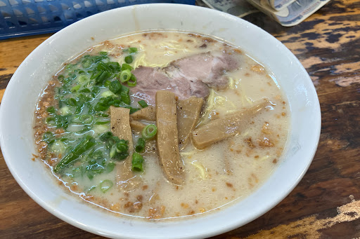 車で移動中にラジオで藤枝市内のラーメン屋さんで朝早くからオープンして閉店時間がどんどん早くなるという内容でとっても美味しいとリスナーさんからの投稿で紹介されていました。気になっていたのか?早起き出来たので、駅前のホテルから徒歩2kmの所にありましたが朝のお散歩がてら行ってみることに。。5:30。。まだ暗い中、営業していました(^^)しかも並んでる!自分が店内に前のお客さんが、奥まで行ってかがんで何かを取っている。。ビール🍺がセルフかと思ったら、冷やされたグラスを持ってお水を入れていた。前の人に習って自分もお水を持って来て空いている席に。。座った席には1000円札と100円玉と50円玉が乱雑に置いてある。。少しテンパってしまっているところに店主が無言でコチラを見ている。。すかさず初めてなのでと言うと、ラーメン作りを続ける店主。訳が分からず隣の方に何を頼んだら良いか聞いてみた。自分はまるげんと一言。そのまま、まるげんお願いしますと注文すると、店主がまるげーんと言ってくれた。あとから入ったお客様はまるげんチャーシューと注文。チャーシューとかトッピングがあったのかと思っていたら店主が目の前で高菜を山盛りに入れていた。色々ありそうだけどよく分からず待っていると、ほかのお客様から替え玉と声が出た。。替え玉もあるのか!と思っていたら店主が左から客に替え玉するかどうか聞き出した。。する、する、隣から聞こえて来て自分の番が来て思わず、はい!と答えた。。どうやら麺が残りわずかだったらしく、店内の客に聞いた後にあと4つと言いながら指を4本立てていた。。ようやく自分のラーメンが届いた。めっちゃ美味しそう😋とんこつスープにストレート細い麺。ニンニクチップとメンマとチャーシューにに刻んだ小ネギ。とってもスープが美味しい😋みんなこの時間は何ご飯なのか?って思いながら美味しいラーメンをいただきました。そうしているうちに、麺が終わってしまって、来たお客さんに、ごめん🙏おわっちゃったと。。だんだん閉店時間が早くなるって言うのはこうゆう事なんだなと思いました。替え玉も約束通り頼んでお腹パンパン‼️美味しかった。お店を出たのは朝の6時過ぎ。。もはや幻のラーメンですね。。 大変美味でした。ご馳走様でした。。 店内で写真を写している人がいなくて、小心者で、写真撮るなら帰れと言われたら嫌なので写真は外からしか撮れませんでした。。。けど写真の投稿があるんだがら大丈夫だよね。。 振り返ってよく見るとメニューがあった。まるげんラーメン700円、とんこつラーメン650円でした。メンマ、高菜、100円でチャーシューが200円、替え玉が150円。なので850円でいただきました。金額もわからずに隣の方に教えてもらいました。自分で目の前のお金があるところでお会計を済ませる。大変客を信用しているお店でしたね。余...