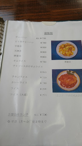 Read more駐車場はお店前に5台有ります。駐車の際は後続車、対向車に注意が必要です。他にも駐車場の案内がありましたが、ちょっとわかりませんでした。 今日はチリソースがけオムライスを食べました。少し辛めで玉ねぎがシャキッとした歯応えのチリソースは食欲がわきました。オムライスのご飯は白米でくどくなくチリソースとの兼ね合いがちょうど良かったです。ボリュームありお腹いっぱいになりました。 テーブル席(4人×3テーブル・カウンター1席かな?・2人×1テーブル)とお座敷がありました。 オーナーご夫婦も親しげで感じよく、気持ちよく食事を...