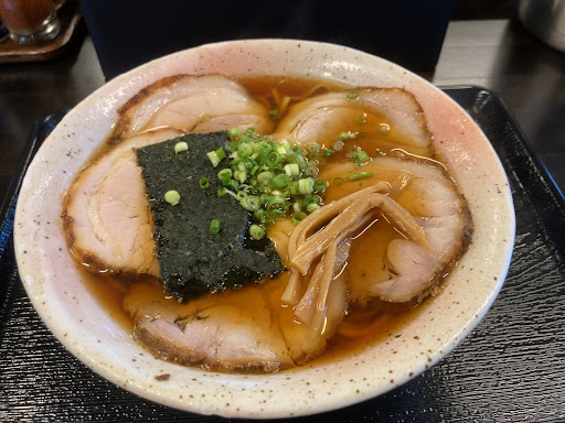 ☆ チャーシューメン(モモ)並 750円 具材はメンマ、海苔、ネギ、脂身の少ないチャーシュー7枚がトッピングされています。 スープをひと口啜れば、動物系の味わいが舌に広がり、ほのかな魚介の香りが鼻から抜けていきます。 朝の胃袋に優しそうな油控えめのあっさりとした醤油味です。 具材の間から顔を出した麺は、やや太い平打ちストレートで啜り心地が良く、もっちりとして食べ応え十分。 朝にぴったりなあっさり味で、すいすい食べれてしまう志太系ラーメンの神髄を堪能しました!