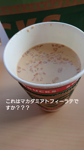英語とスペイン語のレビューもあります 今週の月曜日に行って、お持ち帰りでマカダミアトフィーラテを頼んだですが、事務所で飲もうと思ってて、飲んだら「あれっ」ふたをあけると普通のラテとナッツだけでした、ホイップクリームなし!トフィーもなし!!こんなバリスタのミスははじめて!!
