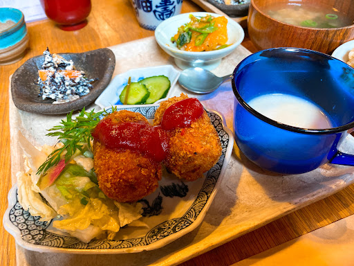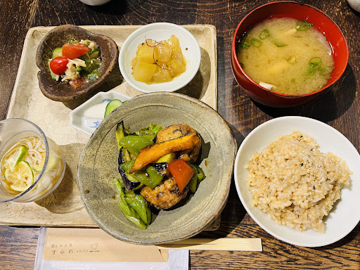 副菜から全部おいしくて、感動。 お味噌汁はやさしいお味。 きゅうりとトマトの胡麻和え、 こんなちょっとじゃ足りない〜! もっといっぱい食べたい😭 そうめんのカボス乗せは、 お出汁があまりにもおいしくて、 一緒に行った人も全部飲んでた😂💕 冬瓜麻婆も、ちょうどいい辛さ。 メインのオートミール入り豆腐団子と野菜の黒酢あんは優勝🏆✨ オートミール実はちょっと苦手だけど、 全く感じない。 きくらげと玉ねぎ入ってて食感も味も最高。 肉っけのないプレートだなと思ったけど、 めちゃくちゃ大満足。 特に玄米が、あまり食べたことのない食感で、 もちもち!なのに食べ応えのある芯がちょっとだけある! 圧力釜で炊いてるらしい。 合わせて食べる胡麻塩がこれまた美味しい! 黒胡麻と黒塩を炒っていると。 は〜、手間がかかると美味しくなるんだなぁ。