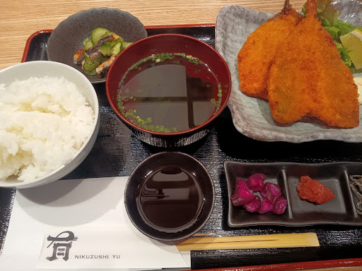 ■アジフライ定食をいただきました。 内容は、ご飯、アジフライ、サラダ、お吸い物、小鉢、香の物、ソースなど。 小鉢は鰻ざく。 香の物は、柴漬け、明太子、塩昆布。 ふんわり、サクッと良い塩梅に揚がったアジフライ。 お吸い物は味がくどくて残してしまいました。 御馳走様でした。