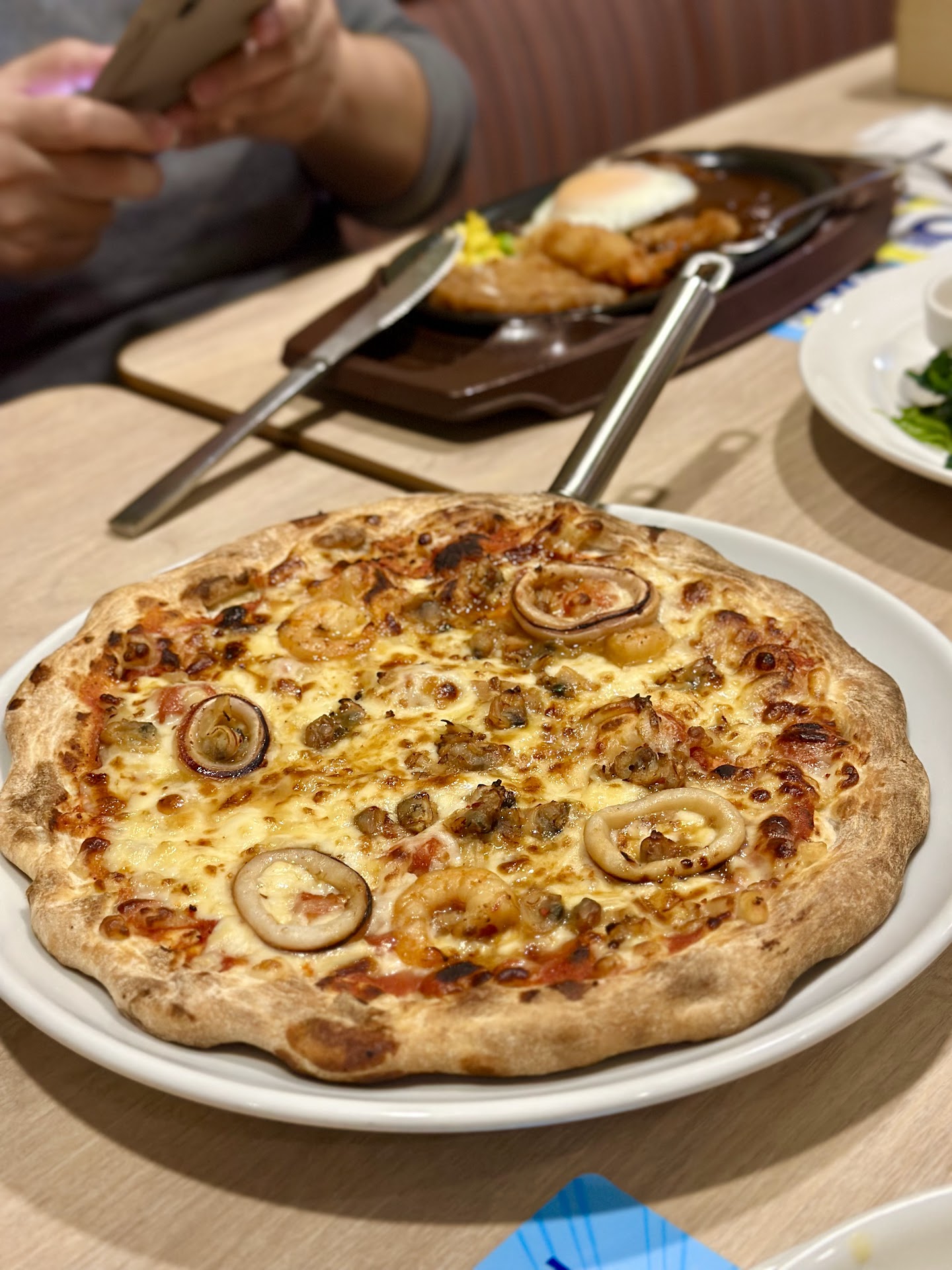 ordered a seafood pizza for sharing and we were pleasantly surprised at how good the thin crust was. crispy but still had a bite to it, and the pizza toppings really had a mixture of squid, prawns and clams with seafoody taste and aroma.