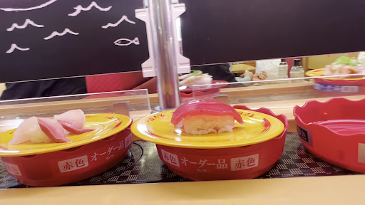 Standard conveyer belt sushi. We went at 4:30pm on a weekday and it was pretty empty, so we mostly ordered from the tablet screens. Don't expect much of any human interaction. It is basically like being fed from a constant vending machine. They have a relatively easy English interface for ordering, but it is still a bit difficult for those new to conveyer belt sushi. There is information regarding most of the do's and don'ts, but one thing to note is that the cups, napkins, and spoons are usually found above the conveyer belt area, and pay attention to the plates with the red under-bowl and coloured stickers on them (those are special orders, and are for a specific table, so don't take them unless it's yours!)