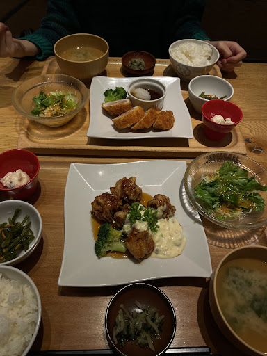 土曜日の晩御飯に行きました、入口は自動発券機ですが大人と子供の人数を入れてからベビーカーの有無とか子供関係の事を入力する項目が多いので小さい子供を受け入れる体制が整っているのかなと思いますが子供無しと入力してもその後も子供関係の入力画面が出てくるので発券に時間がかかりちょっと面倒なので改善して欲しいです。 夜7時半を回っていたので待ちは無く直ぐに案内されて席も2人席で良いか確認してくれましたが少し広い席を希望したら直ぐに対応してくれたのは良かったです。 オーダーはメニューが置いてありますが基本QRでの注文です、テーブルには呼鈴もあります。 料理はお盆に盛られたセットがメインでご飯を白米や五穀ひじきご飯と選べて量も普通と少なめが選べます。あとご飯味噌汁はお代わり無料で呼鈴で頼めます。あとはおかずのトッピングとご飯のトッピングが追加で頼めます。 肉料理から生姜焼きを頼みましたがタルタル味噌を追加50円でトッピングしました。お盆にはご飯、味噌汁、サラダ、ポテサラ、昆布系の小鉢、しば漬けがあり見た目の種類はあります。メインの生姜焼きにも薬味がちゃんとのってキャベツの千切りもありますが3切れしかないのは男性にはちょっと少ないかなと思われるので1切れづつ追加出来たら嬉しいです。味の方はメイン副菜ともに可もなく不可も無くの普通に美味しかったです。タルタル味噌も味噌感は主張し過ぎず味変に良かったです。ご飯は卓上にごま塩があるので有り難いですしお代わりで五穀ひじきご飯にも変えれましたがほのかな塩味で美味しかったです。注文時に食後に追加+250円でアイスコーヒーを頼みましたがやはり量が男性には少し少ないかなという印象ですが香りも良く味も普通に良かったです。 全体的な印象としてはランチに子連れのお母さん達のグループに良いと思いますし小さい子供のいる家族向けかなという印象です。 値段的にはドリンク付けて2人で3510円でしたのでお得感から言ったらお代わりしないとちょっと…かなと思いました。けどメニューが豊富なのと和デザートが気になるので次行ったら違うのを頼...