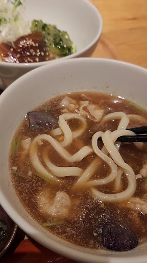 うどんはコシがあってツヤがあり、つけダレの茄子と豚肉も甘味があって美味しかった😋 漬け鮪は薄くて2切れしかなかったのでやや物足りない感じはしたものの、セット商品なのでこんなものかな、という感じ。