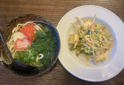 ゴーヤチャンプルーが非常においしくて、もう一皿頼みそうでした。(写真は少し食べてしまっていますが、鰹節がおにょおにょ動く熱々で出てきます)