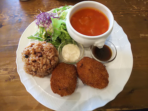 Read more駐車場がないので、ビックエーの有料に止めて伺いました。 コロッケのプレート(1400円)と日替わりプレート(1380円)とお子さまプレート(1200円)を頂きました。 コロッケが非常に美味しくて、すぐに無くなってしまいました。ミネストローネ?スープも野菜たっぷりで、美味しいです。欲を言えば、男性には少し量が足りないですかね。 子供のプレートは、野菜と鶏肉とパスタさらにスープとリンゴジュースと、すごく充実してました‼️ 私もこちらを食べたいくらいでした。 基本的に味は星4つ 値段が星3つ 駐車場が無い星2つ 総合で...