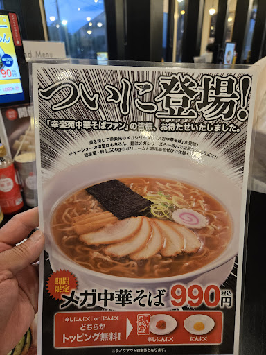 数年前に一度訪れたことがあり、そのときの印象は「あまり美味しくないな…」でしたが、ここ最近「メガ中華そば」というものが期間限定で登場し、どうしても食べたくなり訪問しました。 数年前の印象は体調の問題で間違っていたのか、その後に改良が加わり味が変わったのかわかりませんが、ひとこと「美味しいじゃないか」というのが最初に思ったことでした。 そして、この物価高の中で麺量2.5倍、1.5キロに増量した大きな中華そば、990円というのは破格な価格です! チェーン店の中でもスープにこだわりを感じ、美味しく完食させていただきました。 写真では大きさが伝わりにくいですが、一緒に頼んだ「味噌野菜タンメン」と一緒の写真で比較していただけると大きさが伝わるかな?