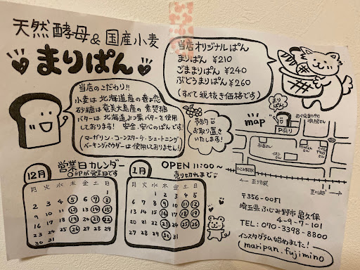 Read moreふじみ野の254号沿いの小さなかわいい天然酵母のパン屋さん。捜していっても見落とすことも。木曜日と土曜日の営業なので、狙っていかないと食べられません。生地が美味しいパンです。香りが良くて、焼かれた中はしっとりしています。 「ぶどうまりぱん」は、かりっと焼かれた外側にしっとりした中身の生地に、ゴロゴロぶどうが入っていて、生地の良い風味とぶどうの酸味が相まって美味しいパン。大人の拳大ですがずっしりしているので、女子なら、これとお茶でお腹一杯になれます。 「くるみまりぱん」は、クルミがゴロゴロたくさんはいっています。食べごたえがあります。 「ハンバーガー」は人気のメニューで、厚さ3cm弱のハンバーグがトマトとチーズと一緒にサンドされています。1個でお腹一杯になります。 「タルティーヌ」は、パンと具材、ソースの風味が複雑に絡み合っていてランチにピッタリです。珍しいホタテがのっているタルティーヌです。カリカリに焼かれた風味の良いパンとマッチしていて満足度の高い一品です。 お店の人も元気で、楽し...