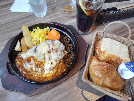 11/11 会社の同僚とランチに。お互いチーズハンバーグを頼みました。チーズは濃厚で味は文句なし。ハンバーグはゆっくりナイフを通さないと崩れてしまうほど柔らかく、肉が入っているのか?と思うぐらいなほど(断面見ると入ってるのは判る)。 ビックリしたのは提供された時は手前のソースがジュウジュウいってたのだが付け合せのニンジン、コーン、ポテトが全て冷たかったこと。だが同僚の方はちゃんと暖かったらしい……不思議だ。 そして、何故か味噌汁なのだが...