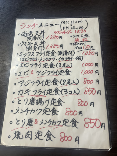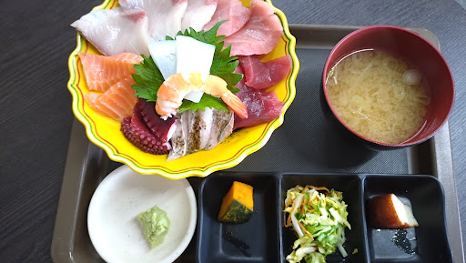 Read more刺身定食はとても新鮮で、量が多くて、どの魚もとても美味しいです。マグロ3切れずつ、2種類か、違う部位かな。ブリ3切れ、カツオ2切れ、しめ鯖、タコのブツ切り、イカ2切れ、サーモン2切れ、茹でた海老、わかめ、しそ、卵焼き、等、日によって多少は違うでしょうけど、まぐろの赤身もジューシーで新鮮な事がわかる。タコはぷりぷりコリコリ歯応えと共に美味しい味が口いっぱいに広がります。特に美味しかったのが、生け〆のブリです。口に入れた瞬間から旨みがすごい。1380円は絶対にお得です。海老天丼定食はとても大きな海老が3本も立って居ます。盛り付けが迫力あります。かじりつくと身がびっしり入ってるのがわかります。茄子も見栄えも良いし、茄子の天ぷら美味しいよね!あと、椎茸の天ぷらに、大葉の天ぷらなど、味噌汁は鰹の味が美味しいです。天丼が豪華なのに刺身も付いてるのは凄すぎる。しかも、まぐろの赤身2枚、生き〆ぶり2枚とたこぶつ2個と刺身の代表的な美味しい組み合わせ。サラダも付いてる。今回は、追加でカキフライ定食も食べました。カキフライは3個、まぁまぁの大きさで身がびっしり入ってます。どこ産なのかな、3個とも牡蠣の内臓、緑の部分がほとんど無かった。内臓苦手な人には最高かも。ただ、牡蠣の独特な風味は緑の部分からなので、牡蠣を食べてると言う感じがあまり無かった。また、次の機会に期待します。家から50km有るけど、何度も行きたいお店に成りました...