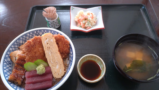 Read more駐車場は砂利だけど広いです 座敷だけかと思ったら入ってすぐの所にカウンターが3人分ありました 都丼がお勧め(みやこどん) 丼の上にソースカツ1枚▪鶏肉2枚 握り寿司の上にのりそうな卵焼き1枚▪鰻1枚▪マグロの赤身3枚▪飾りで胡瓜2枚と味噌汁付...