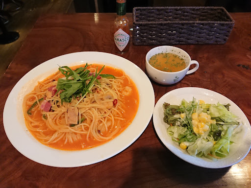 いただいた“ピリ辛トマトスパゲッティ”は程よい辛さの味付け良いスープスパで美味しかったです!“モンブランオーマロン” は優しい甘さのマロン&生クリームたっぷりで中にアイスも入っていて とても美味しかったです!! オシャレトロな空間でコクある美味しいコーヒーもいただけ大満足のランチが出来ました!ご馳走様でした~また伺います!!