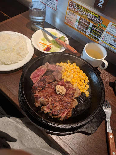 1年ぶりにフレスポ藤岡店に入った。14時お客様は0人。外から見て閉店したかと思った。中に入ると一番安いランチ、赤身・肩ロースステーキ150gご飯サラダスープ付1410円+黒烏龍茶お祭りアプリ50円=1人1460円を食べました。固いスジ有り輸入牛肉、サラダは超少なくスープもマズい。その後1時間で2人1組しか来なかった。ランチだのにお得感が無かった。お客様が引いている気がしました。